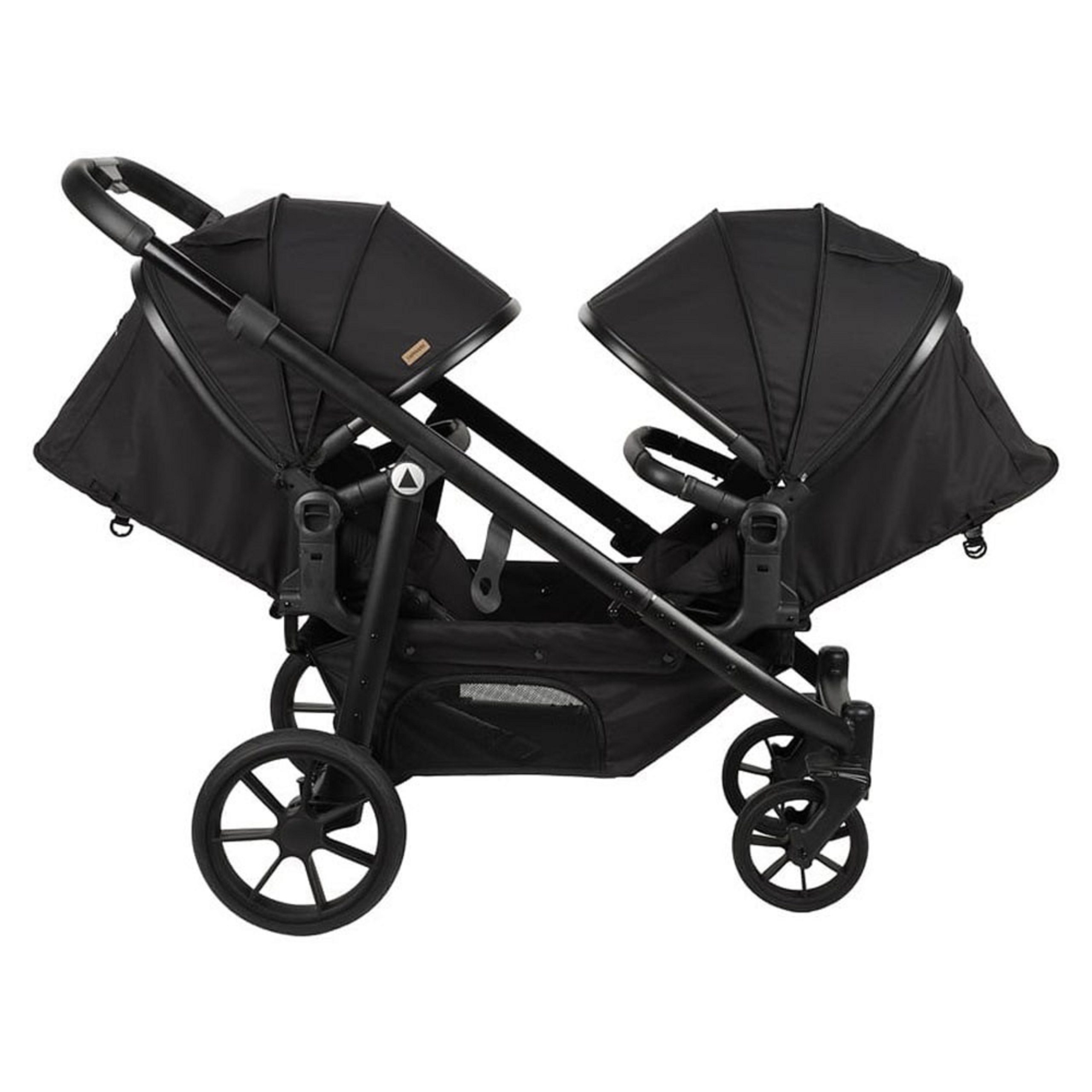 The stroller comes standard with an aluminum frame, 2 x buggy inserts with leg cover and rain cover, an adapter set for Maxi Cosi car seat, and a spacious shopping basket. The buggy insert can be placed in 2 directions, the push handle is adjustable in height (min. height 95 cm, max. height 105 cm), and the single front wheels are swivel and can also be locked. Furthermore, the upholstery is removable and washable.
